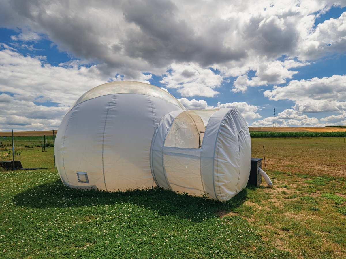 Die Bubble ist luftgestützt und hat einen Schleusen-Eingang. Ein leiser Luftstrom hält die Form und sorgt für Frischluft.