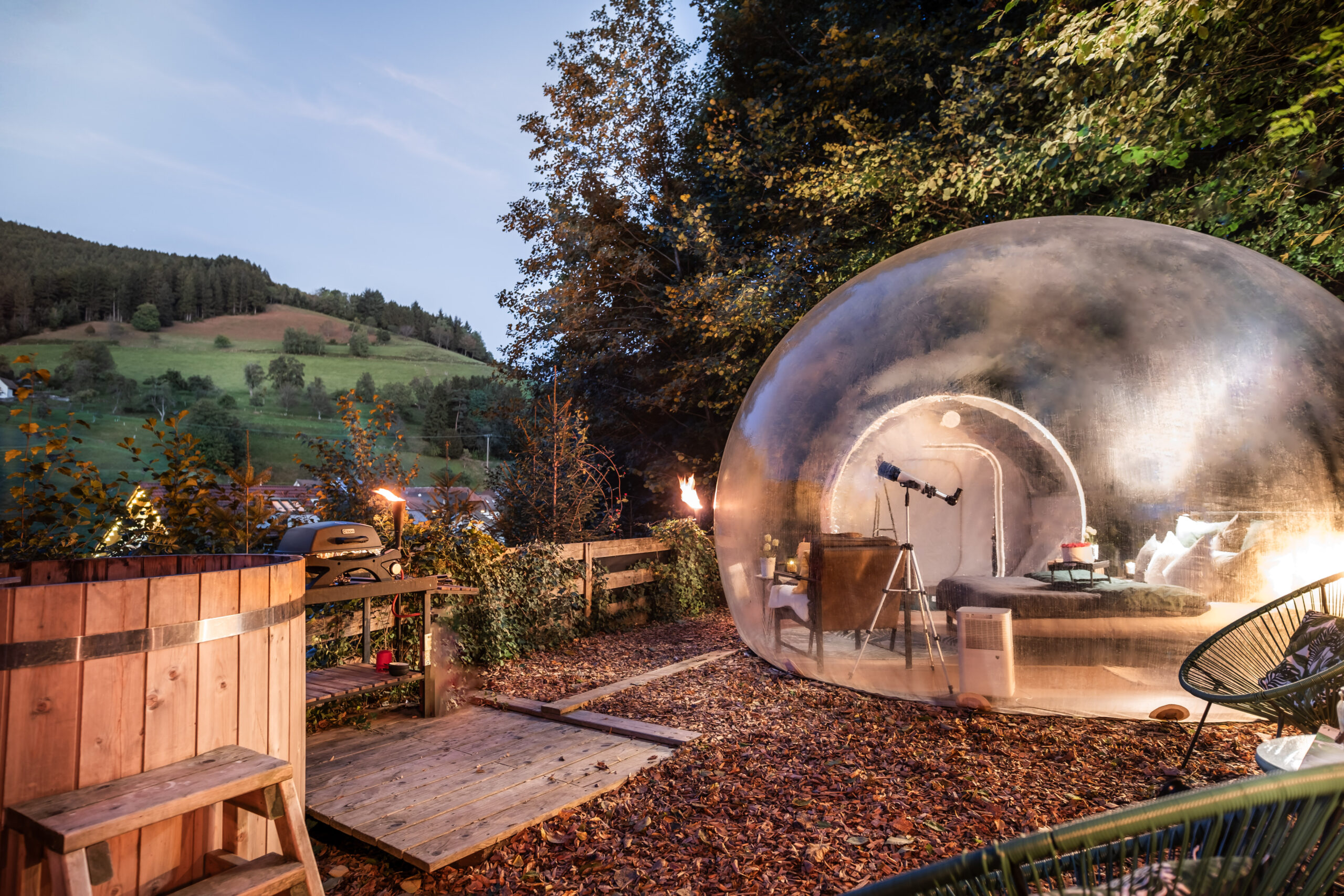 Im Luftkurort Elzach, mitten im malerischen Zwei-Täler-Land, erwartet euch das Bubble Tent Elzach mit einem atemberaubenden Panoramablick über Wälder und Hügel. Hier erlebt ihr die Nähe zur Natur in einem gemütlichen, wettergeschützten Raum mit Blick auf den Sternenhimmel.