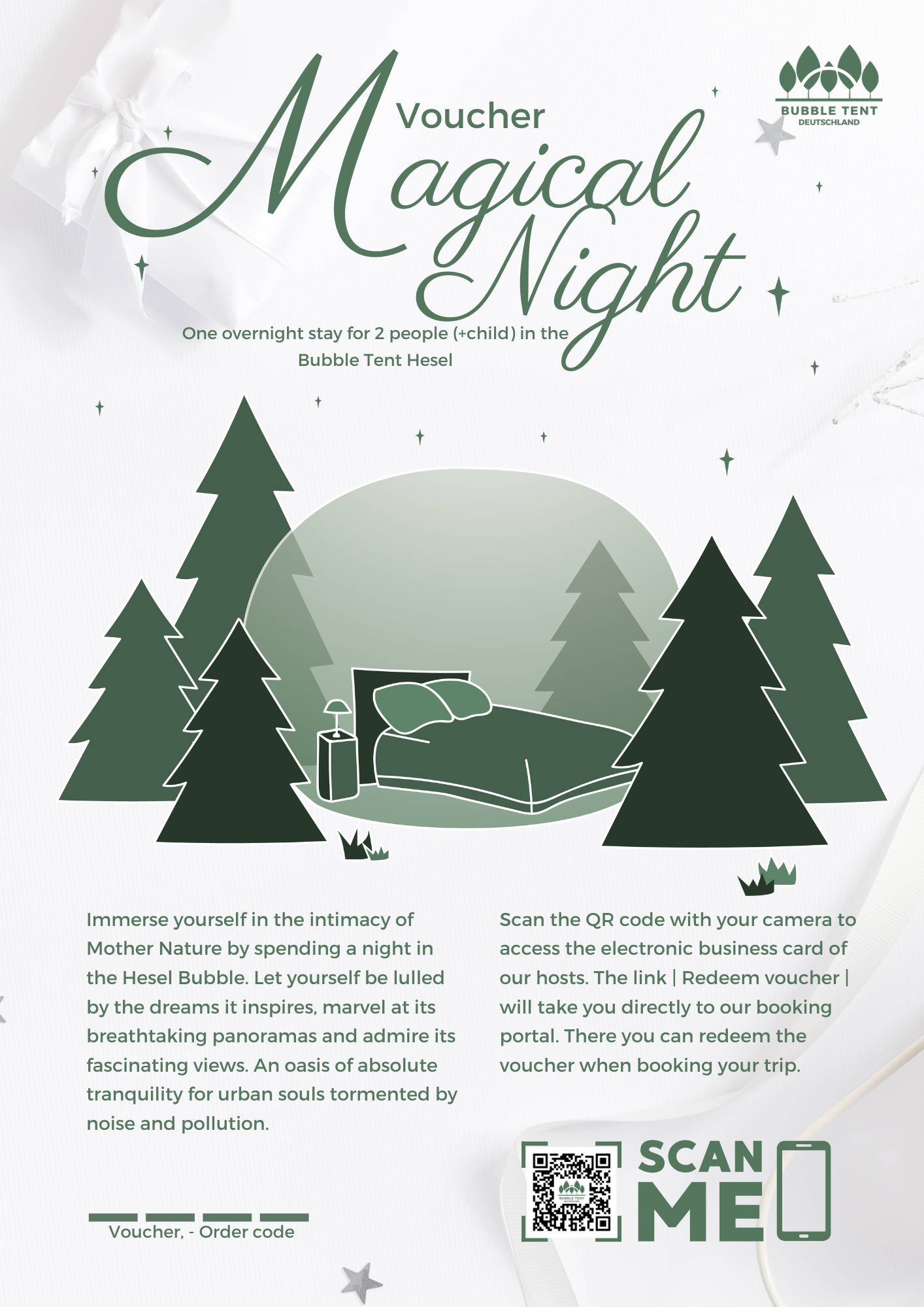 After completing your order you will automatically receive a confirmation email. Immediately after receipt of payment ALL vouchers from the preview will be sent to your email address in PDF format. To give a gift, choose a voucher and write the corresponding order number in the field (order number/voucher code) at the bottom right. The validity of the voucher is determined exclusively by the associated order number